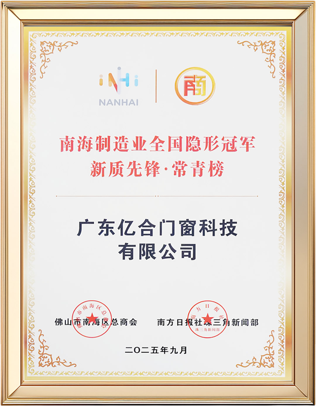 9月26日,“弘扬优秀企业家精神 培育发展新质生产力”南海区企业家日活动隆重举行,2025年“隐形冠军 新质先锋”系列榜单同期发布。作为2020年跻身第二批“南海制造业全国隐形冠军”阵营的企业,亿合门窗凭借出色的经营理念、智造能力、销售规模、管理水平、科技创新、人才队伍、社会信誉等,历经多项严苛指标审核与综合评估,成功荣登2025年“南海制造业全国隐形冠军”新质先锋·常青榜,彰显出企业在长期发展中沉淀的强劲韧性与领先实力。